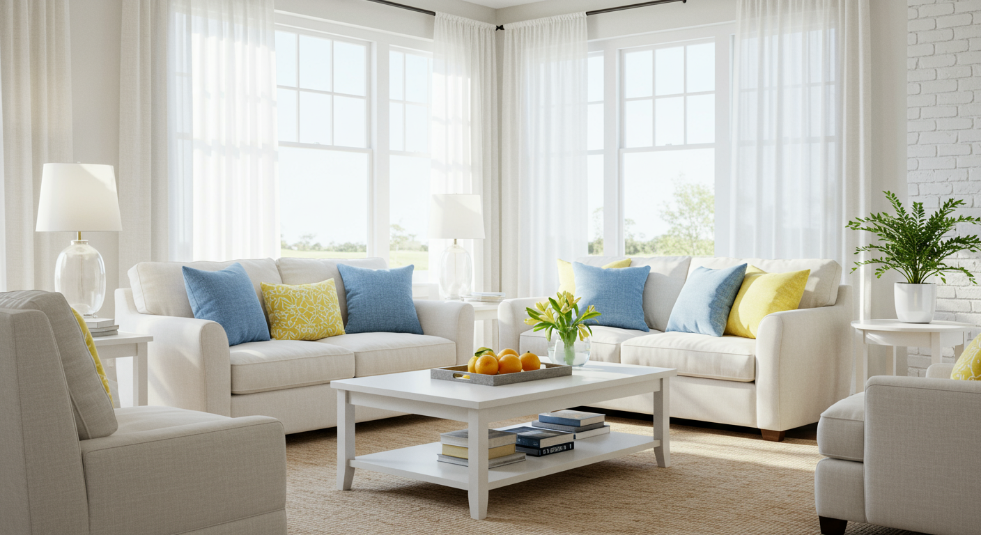 Linens warm up a space, making it feel inviting and cozy. They also are an easy way to add color to a room. Consider adding some pillows and a couch throw in seasonal colors and styles. Similarly, you can use cotton rugs to center seating areas and provide another element of warmth.