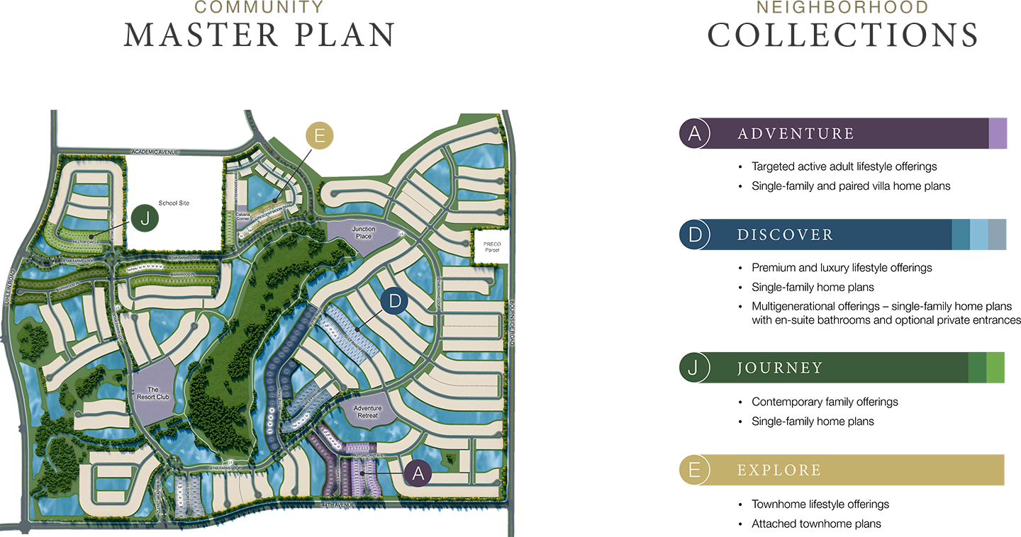 The community is arranged into four areas called “neighborhood collections:” Adventure, Discover, Journey, and Explore. Each collection is designed to provide specific lifestyle experiences.
